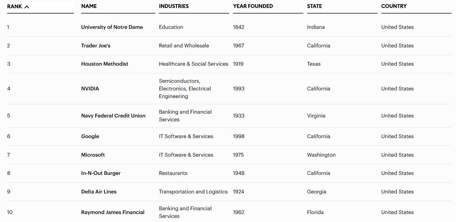 Top 10 Best Places to Work in America